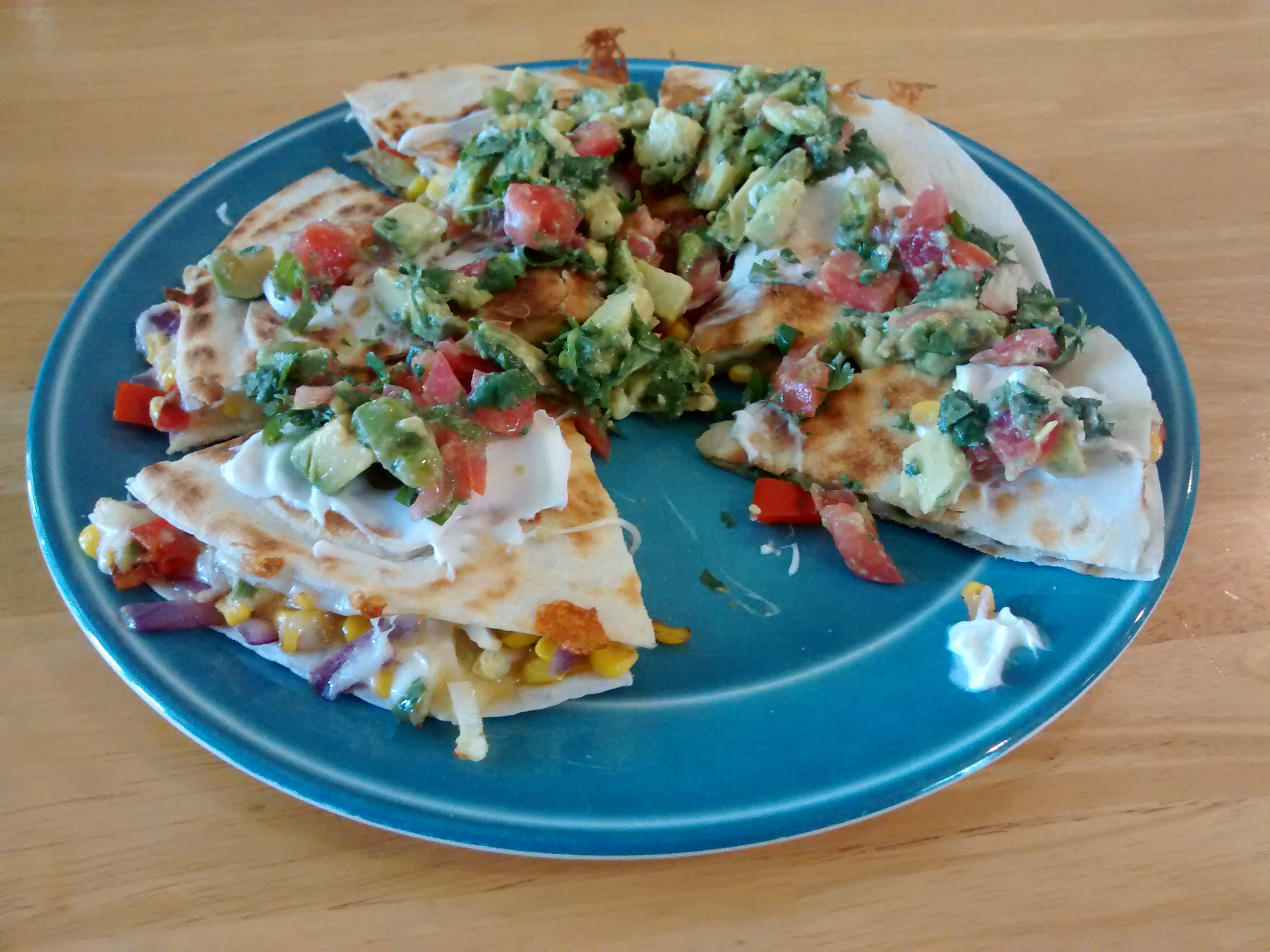Take the corn and other vegetables and toss them in a hot frying pan with a teaspoon of coconut oil. Heat until the spinach is just barely wilted and the cabbage is getting a little transparent. Take your hot vegetables and place them on top of a tortilla that has been placed on a griddle with a half the cheese on it already. Now add the other half the cheese to the top of the vegetables and seal the whole thing in another tortilla. It should go: tortilla, cheese, vegetables, cheese, tortilla. The two layers of cheese are necessary. Heat the griddle on medium heat until the bottom tortilla is golden. Flip. Heat until what used to be the top tortilla is golden as well.